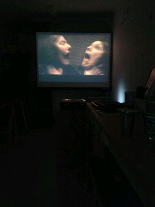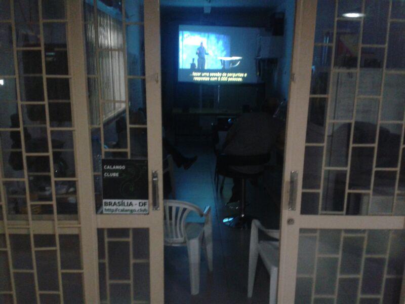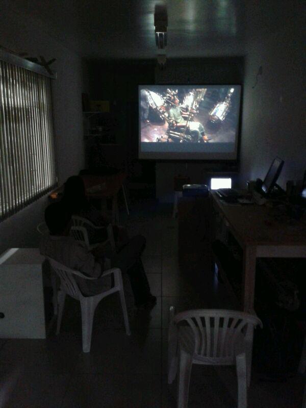 Obs: foi uma sessão do tipo “se não tem cão, caça com gato”, por problemas com meu projetor, exibi o filme na tvZona que estava por lá (foto 01); e também de resitência, já que o público ficou reduzido a eu mesmo. o show não deve parar! mas confesso que dei uma pausa pra comprar umas cervejinhas para seguir até o fim da sessão solitária - e notem como minhas botas estão sujas na foto 02 acima. hahahaha